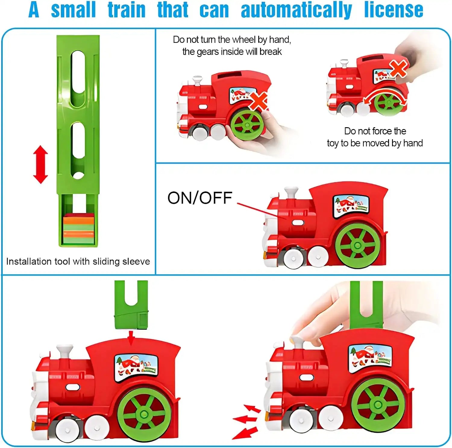 • 🚂Easy To Set Up and Knock Down -- Place the dominoes neatly in the train chimney, then attach the chimney bracket to the locomotive and they will stay there until the electric train releases them one by one as it travels on the ground, leaving a perfect row of dominoes waiting to be knocked down. You can also turn the button while the train is moving to change the direction of travel.