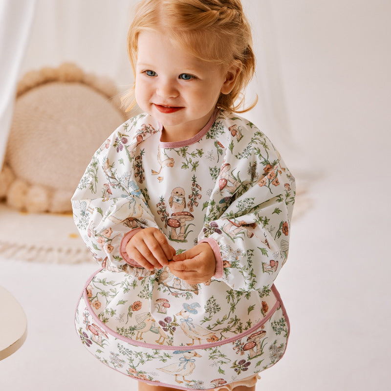 • Elastic Cuffs & Round Collar: Protects baby’s neck and wrists from chafing or food mess.