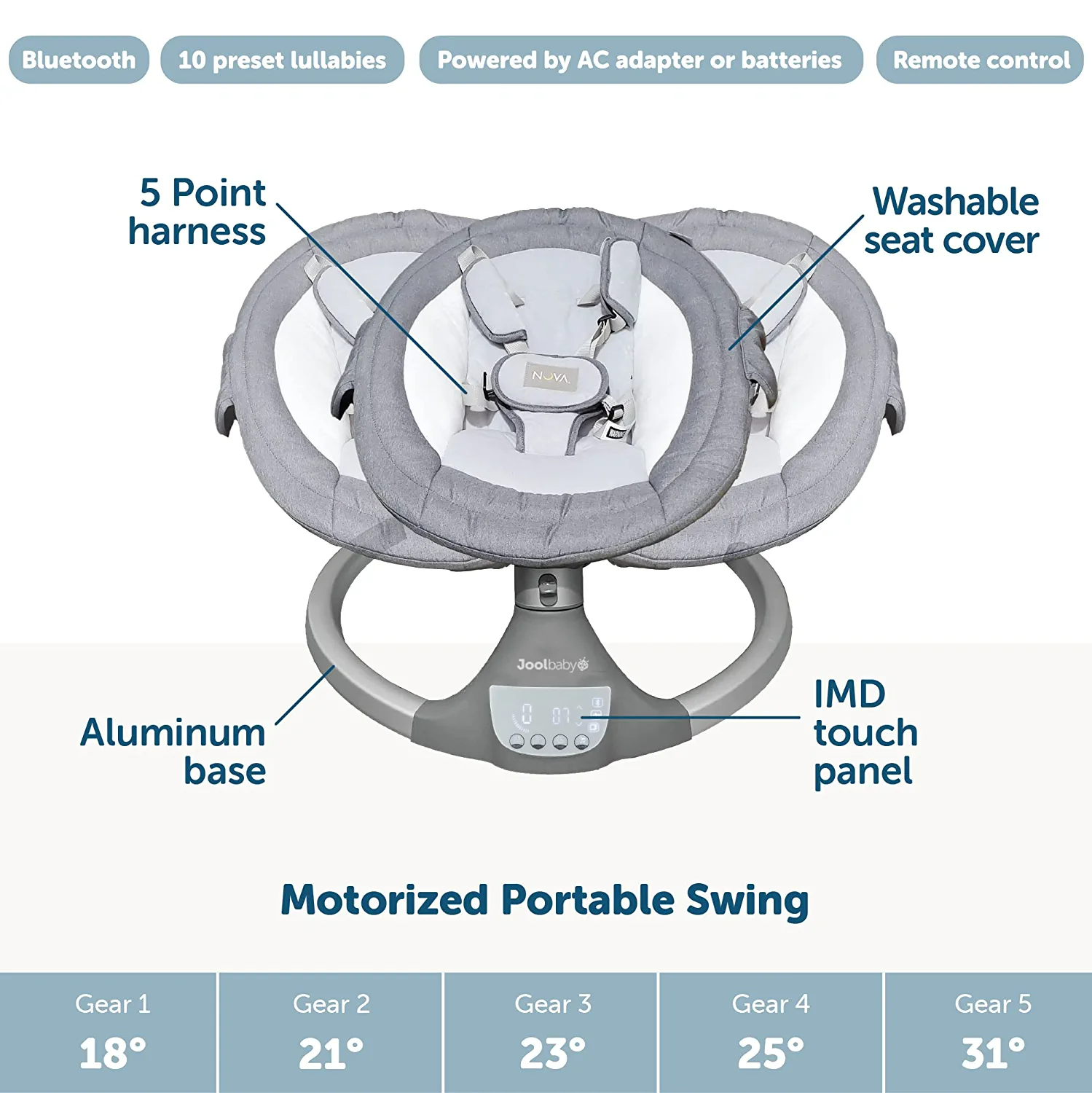 The BABY Swing features 10 preset lullabies, Bluetooth and USB connectivity options, an auto-off timer, and a soft and cozy seat that will soothe and calm your little one. Ideal for babies 0-6 months and below 20 pounds.