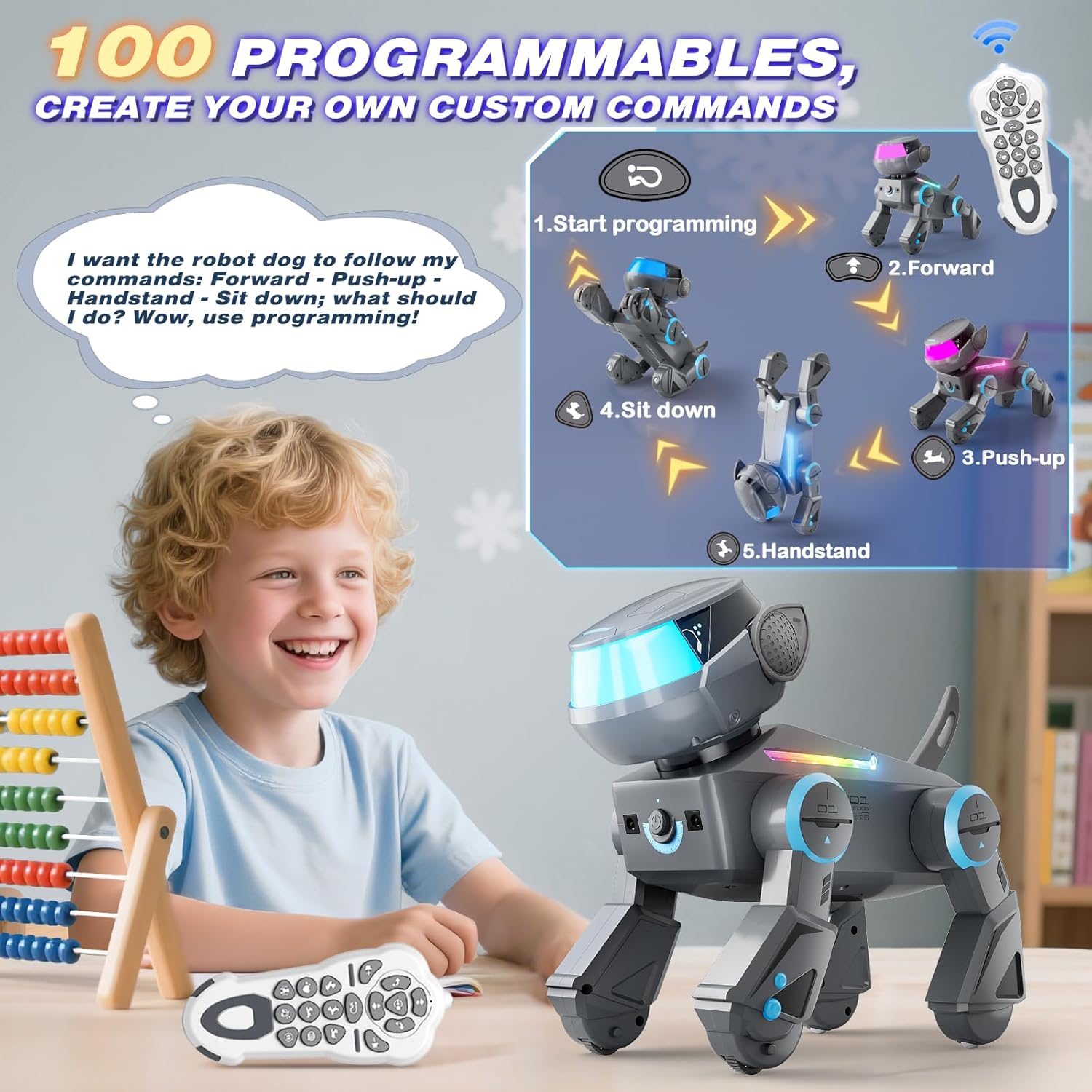 • 【100 Programmable Actions】100 customizable command sequences to unleash creativity! Children can freely create personalized routines like "sit → stand → sing → dance," and the robot dog precisely executes every programmed instruction, providing an unparalleled interactive experience. Children feel like they are talking to a real electronic pet, stimulating their logical thinking and creativity while having fun.