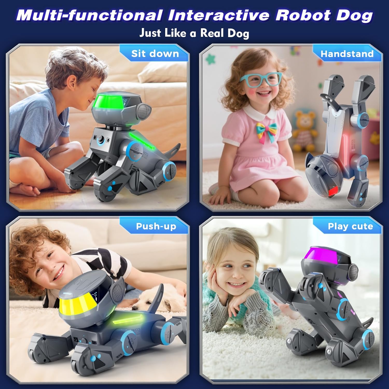 • 【Surprising Interactive Technology Gifts】This smart robot dog will definitely make your kids scream! Its futuristic, tech-inspired design and vibrant dynamic lights give it a tech-inspired feel the moment it's turned on. It can play music, program movements, and interact with you just like a real dog—obeying commands and acting cute. Whether it's a Birthday, Christmas, New Year, Thanksgiving, this tech-inspired, creative, and interactive robot dog is the excellent gift choice.