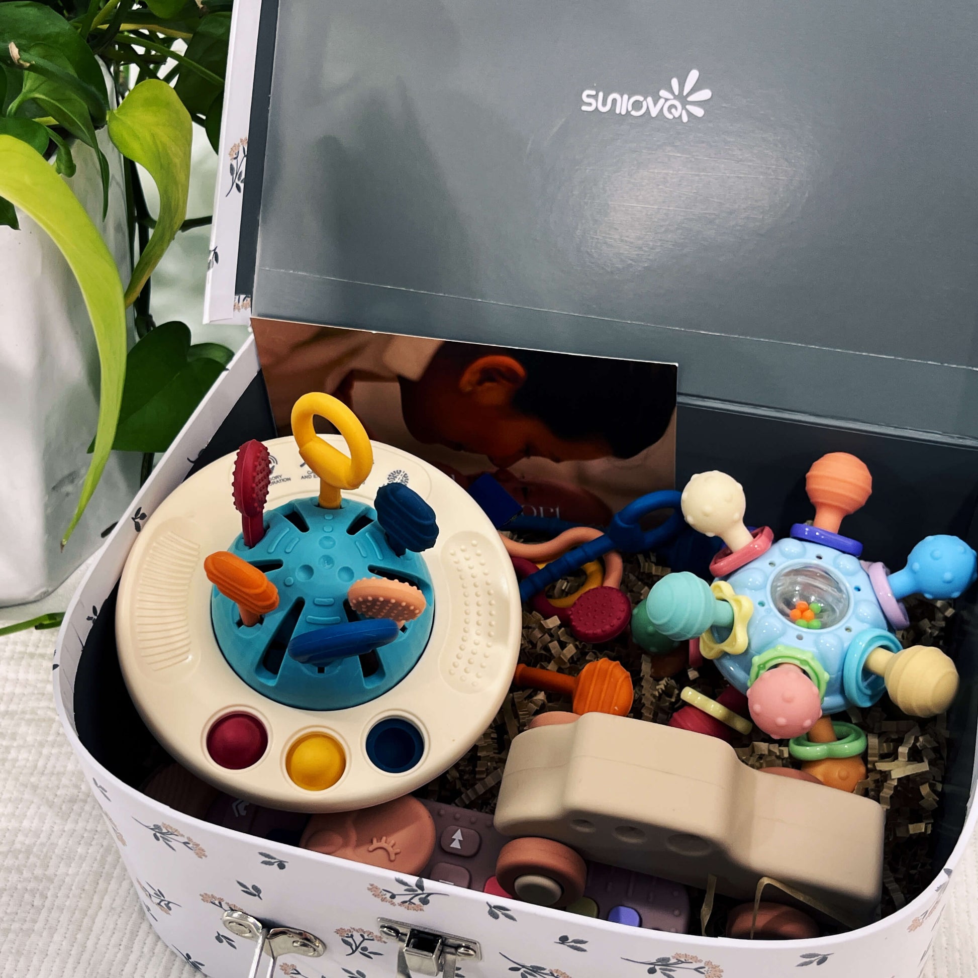Designed for babies aged 0-24 months, the Sunlovekids Sensory Teething & Exploration Gift Set combines soothing teethers, tactile stimulation, grip training, and hand-eye coordination into one essential bundle. This set helps relieve teething discomfort while supporting sensory development and fine motor skills in a safe, engaging way.